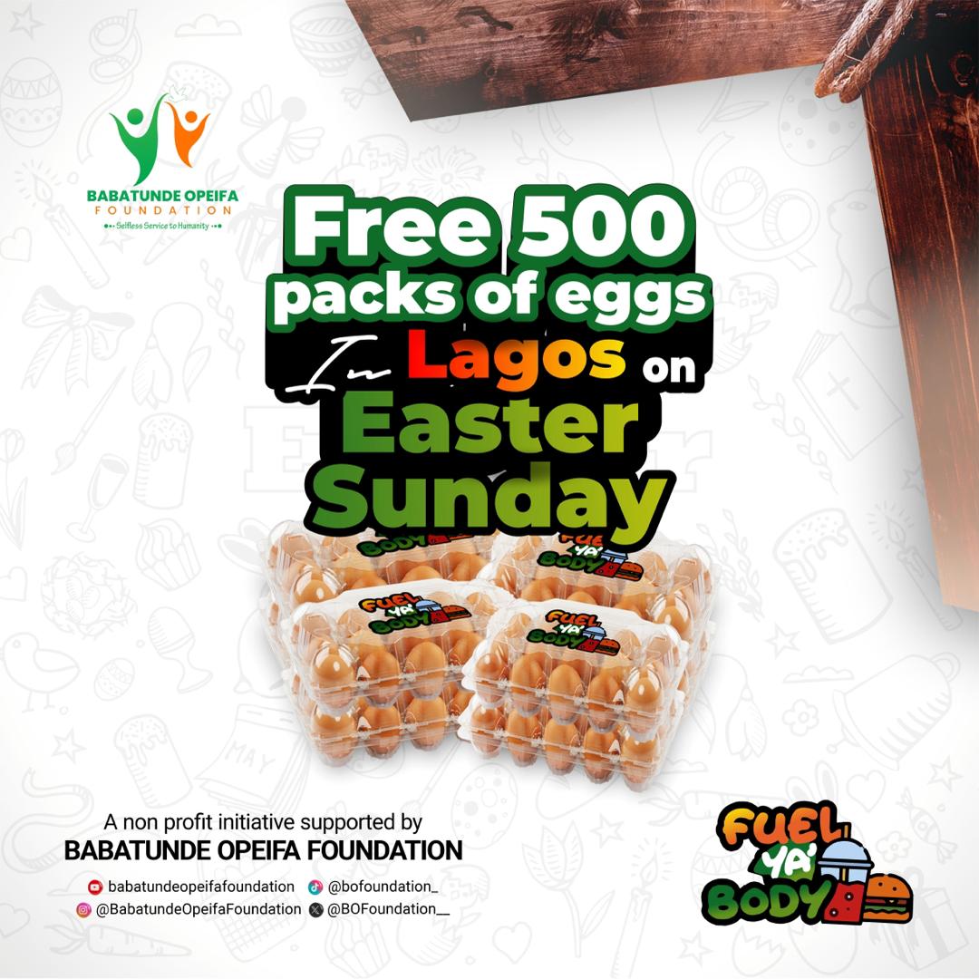 As Easter Sunday dawned in Lagos, the Babatunde Opeifa Foundation embarked on a mission to spread joy and nourishment throughout the community. Under our "Fuel Ya Body" initiative, we launched the "Free 500 Packs of Eggs in Lagos on Easter Sunday" outreach, aimed at providing essential food items to those in need.