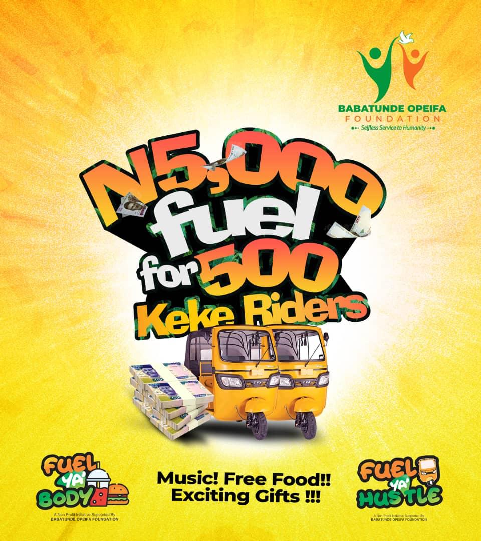 The Babatunde Opeifa Foundation's ₦5000 Fuel for 500 Keke Riders - Valentine's Day 2024 Edition, brought joy and practical support to the Ifako-Ijaiye community in Lagos. On February 14th 2024, at the Conoil Filling Station, College Bus Stop, College Road, Ifako-Ijaiye, Lagos, 500 keke riders received ₦5000 worth of fuel, along with exciting prizes from a raffle draw, including T-shirts, face caps, face masks, engine oil, a blender, and a gas cooker.